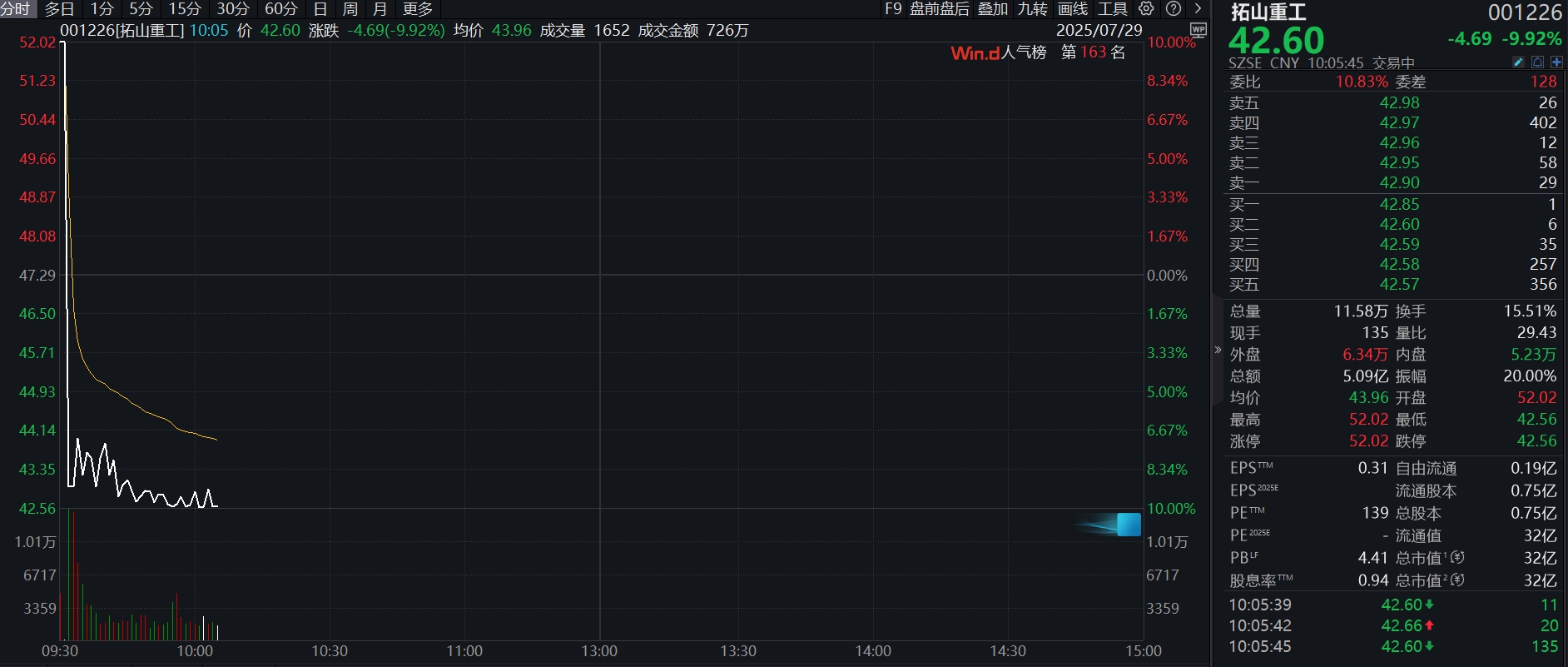 7月29日,拓山重工开盘一度涨停,走出5连板。盘初该股突然直线跳水,触及跌停,上演“天地板”走势。