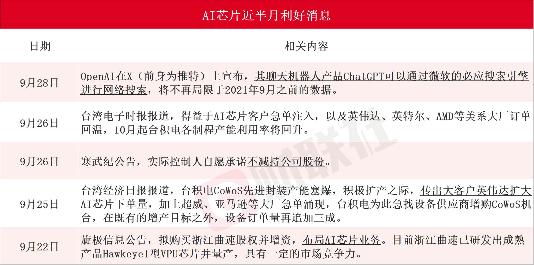 据财联社不完全梳理,AI芯片近半月利好消息不断,具体如下: