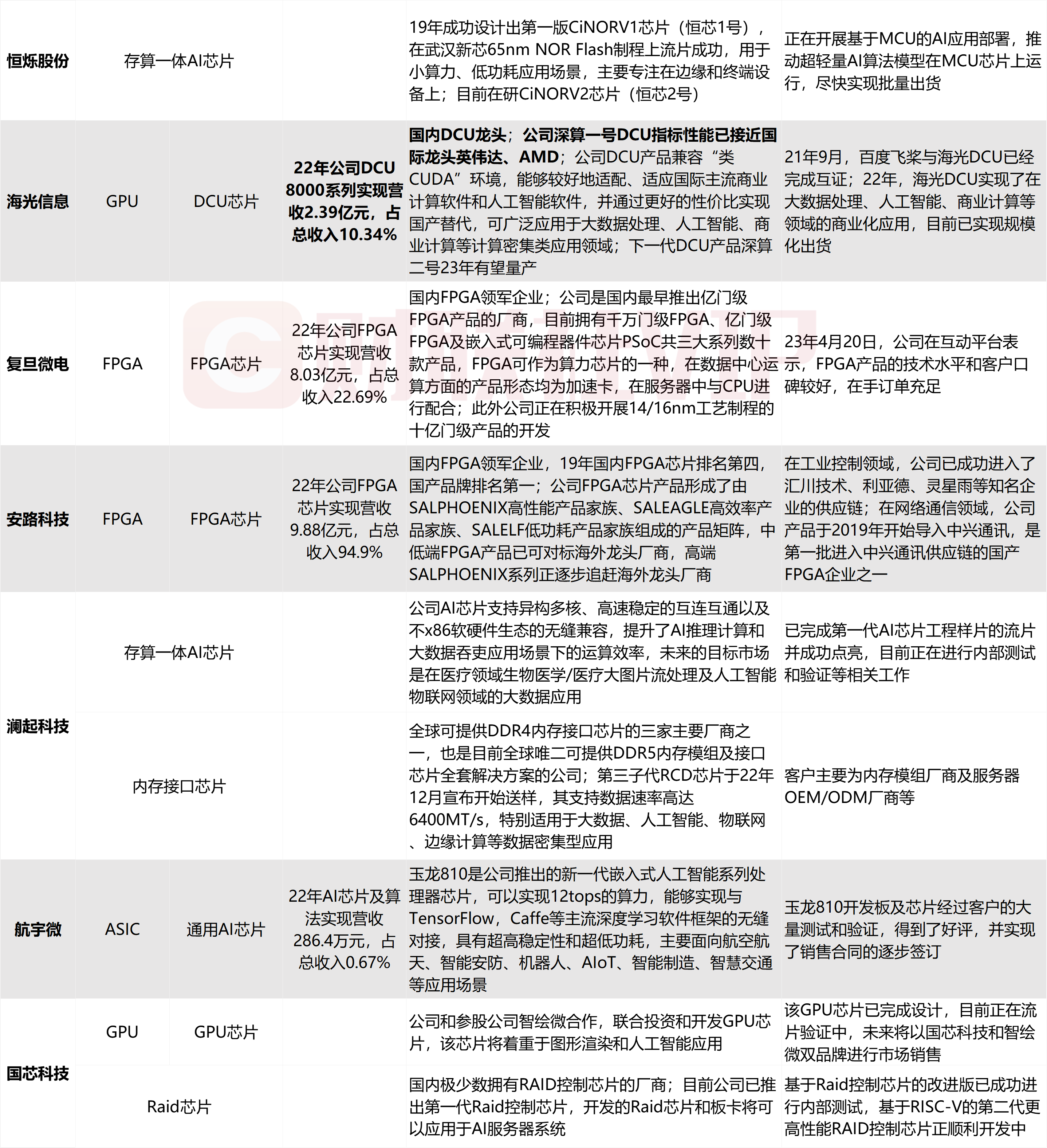 据财联社VIP盘中宝·数据栏目此前梳理,A股上市公司中,有布局AI芯片的厂商主要有寒武纪、景嘉微、云天励飞、恒烁股份、海光信息、复旦微电、安路科技、澜起科技、航宇微、国芯科技、紫光国微、国科微、芯原股份、好利科技、中科曙光、创耀科技、裕太微。上述公司具体的AI芯片类型、AI芯片产品、营收占比、市场地位和产业化情况具体如下表: