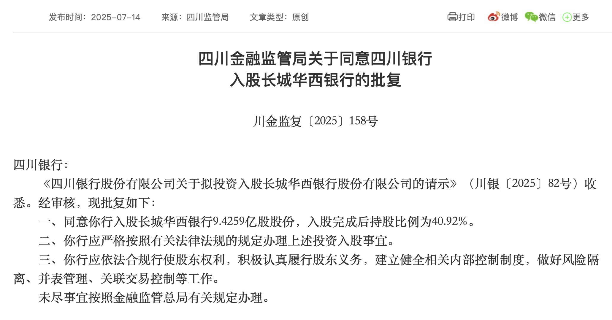 7月14日,四川金融监管局官网发布川金监复〔2025〕158号文件,批复同意四川银行入股长城华西银行。