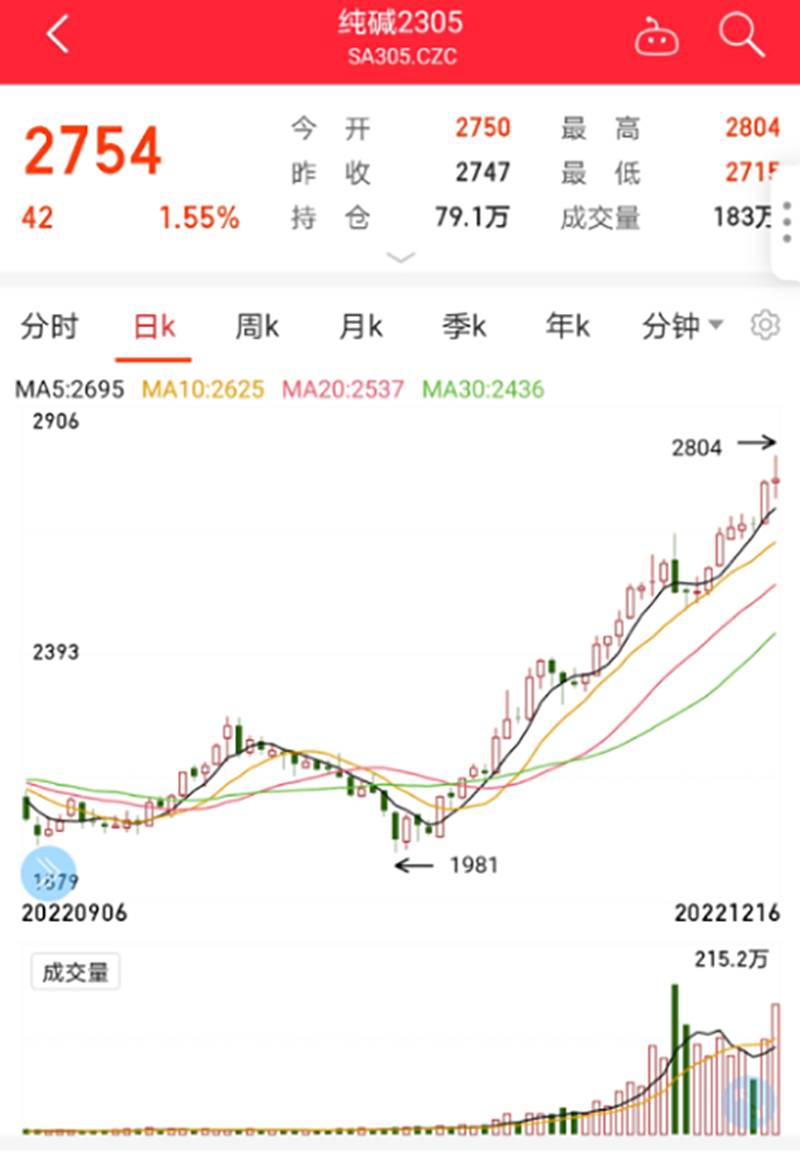 截至国内期市12月16日下午收盘,纯碱主力合约收涨1.55%至2754元/吨,盘中一度触及2804元/吨的高点,创下近6个月的新高。该合约11月以来的累计涨幅已超过34%。