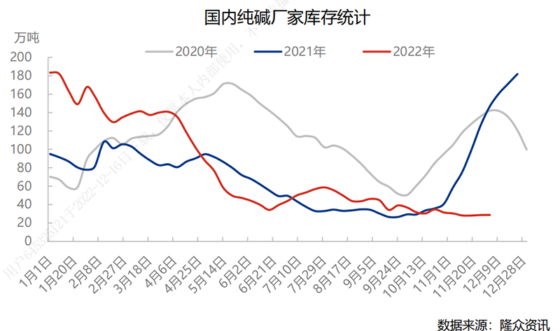 隆众资讯数据显示,截至12月15日当周,国内纯碱厂家总库存量为28.74万吨,远低于往年同期水平。