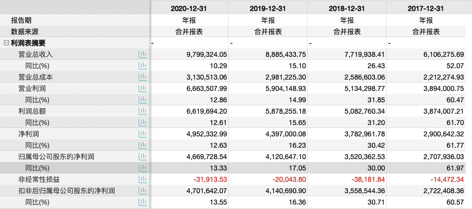 据Wind数据,贵州茅台2021年净利增速为近五年来最低。2017年至2020年,公司归母净利润增速分别为61.97%、30.00%、17.05%和13.33%。