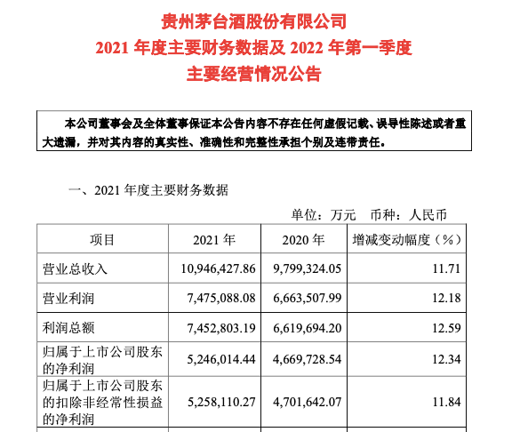 3月28日晚间,贵州茅台披露2021年度主要财务数据及2022年第一季度主要经营情况。