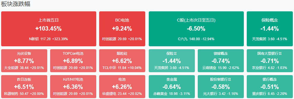 板块方面,光伏、光伏电池、深圳国企改革、风电等板块涨幅居前,保险、贵金属、银行等板块跌幅居前。