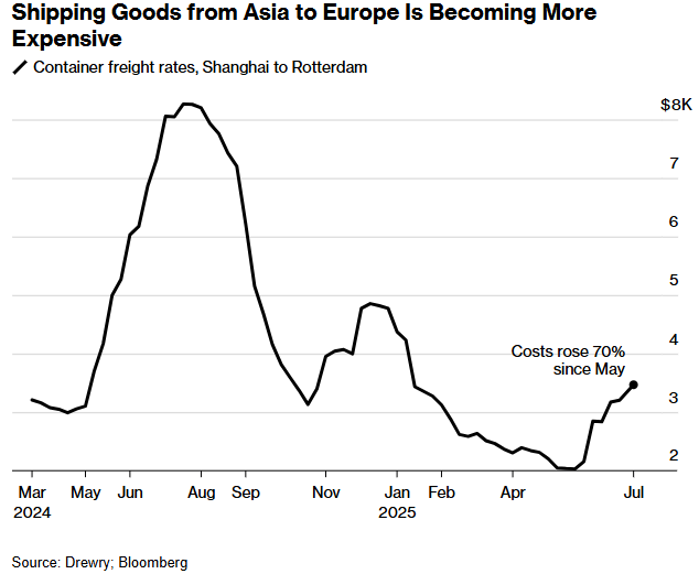 美国企业急于在特朗普总统最新一轮加征关税生效前进口产品,由此产生的需求推高了运费。这吸收了运力,并推高了通往欧洲大陆和英国的其他贸易航线的运输成本。