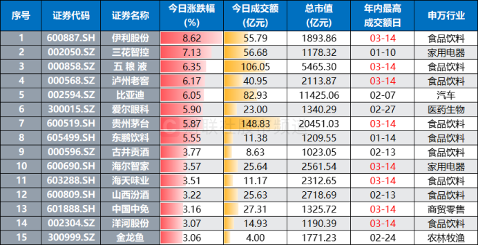 注:今日涨幅居前的千亿市值消费股(截至3月14日收盘)