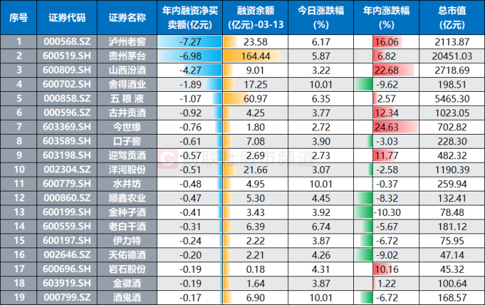 注:两融白酒股年内融资余额变动情况(融资余额截至3月13日,其余数据截至3月14日)