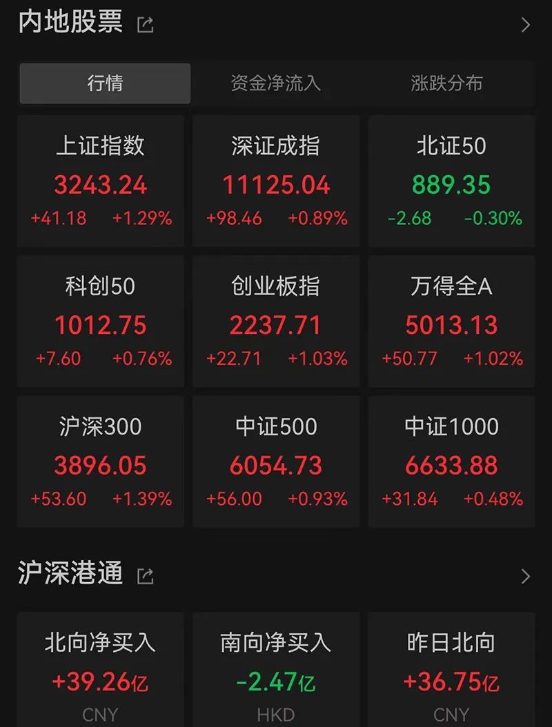 7月第一个交易日,三大指数早盘集体高开。截至午间收盘,上证指数涨1.29%,深证成指涨0.89%,创业板指涨1.03%。北向资金半日净买入39.26亿元,超3000只个股上涨。