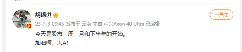 此外,“新晋股民老胡”今日通过微博喊话:“加油啊,大A!”