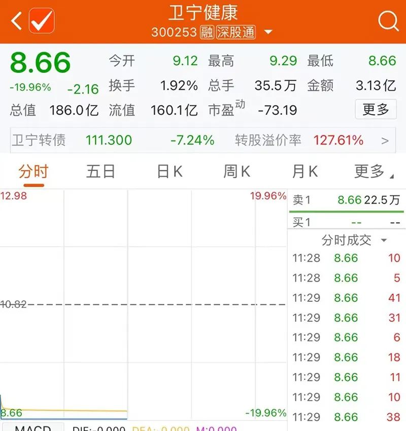 受公司实控人被留置的消息影响,国内医疗健康信息化解决方案龙头卫宁健康早盘大幅低开,很快便以20%幅度跌停。截至午间收盘,公司股价报8.66元,最新总市值186亿元,仍有超过22万手卖单挂在跌停板。