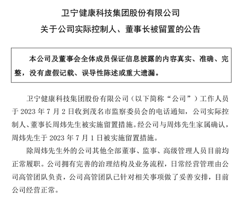 7月3日早间,卫宁健康发布公告称,公司工作人员于2023年7月2日收到茂名市监察委员会的电话通知,公司实际控制人、董事长周炜被实施留置措施。经公司与周炜家属确认,周炜于2023年7月1日被实施留置措施。