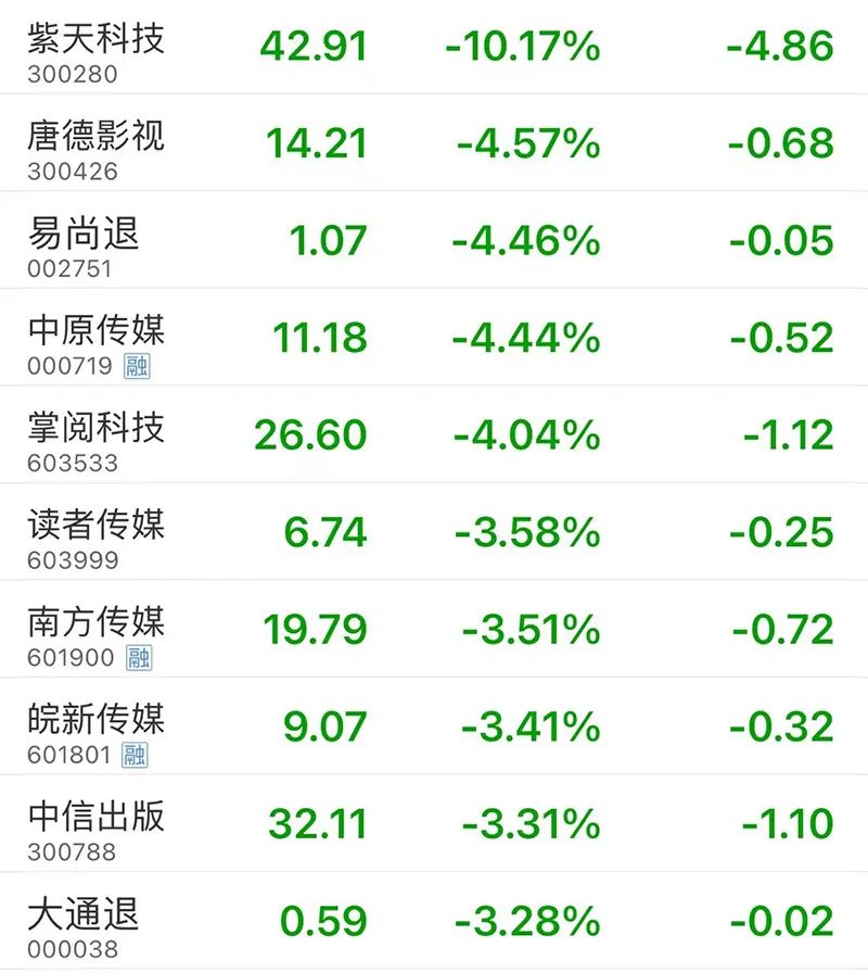 传媒板块中,紫天科技跌超10%,唐德影视、易尚退、中原传媒、掌阅科技、读者传媒、南方传媒等纷纷下挫。