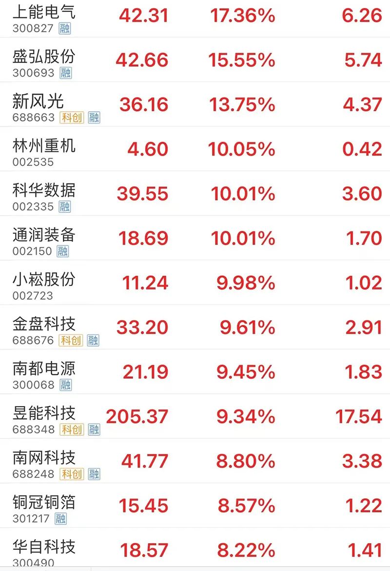 今日早盘,光伏、储能板块集体走强。截至午间收盘,上能电气大涨逾17%,盛弘股份、新风光、禾迈股份涨超10%,林州重机、科华数据、通润装备、小崧股份涨停,金盘科技、昱能科技、南都能源、南网科技等涨幅居前。