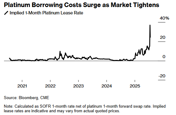今年以来,被誉为“黄金平替”的现货铂金价格已累计飙升了近60%,而随着伦敦主导的场外现货市场中铂金异常短缺,已导致该贵金属的租赁利率接近40%——通常情况下,该利率一直接近于零。