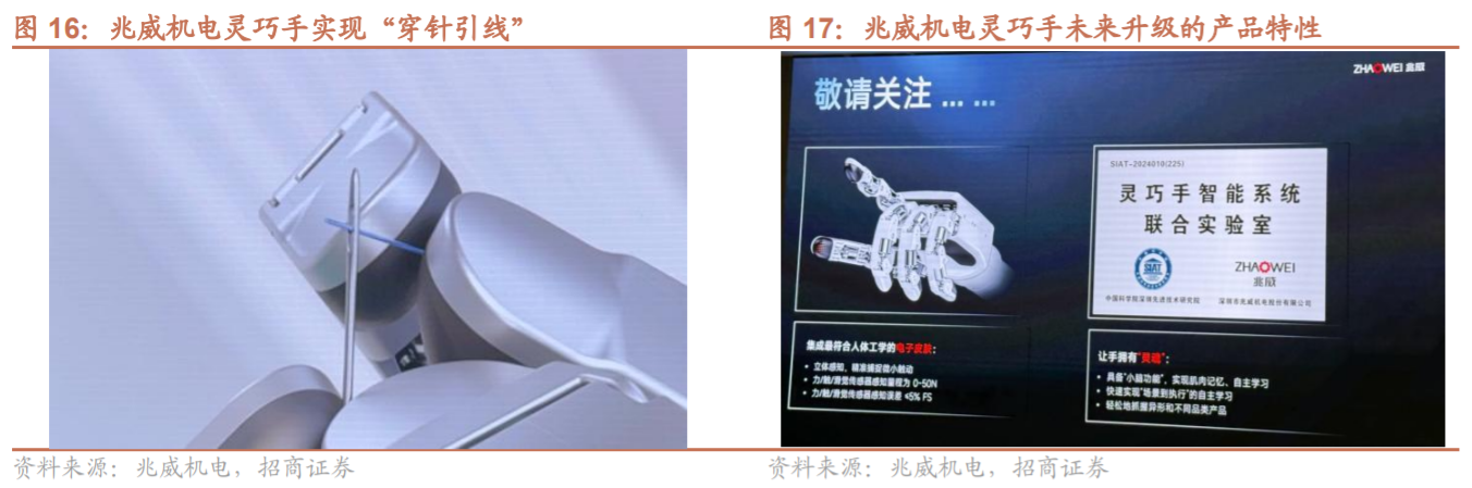 展示灵巧手“穿针引线”等应用场景,未来升级的产品特性包括“电子皮肤”、“小脑功能”等。兆威展示了其灵巧手在“穿针引线”等应用领域,同时表示未来升级的产品特性包括: