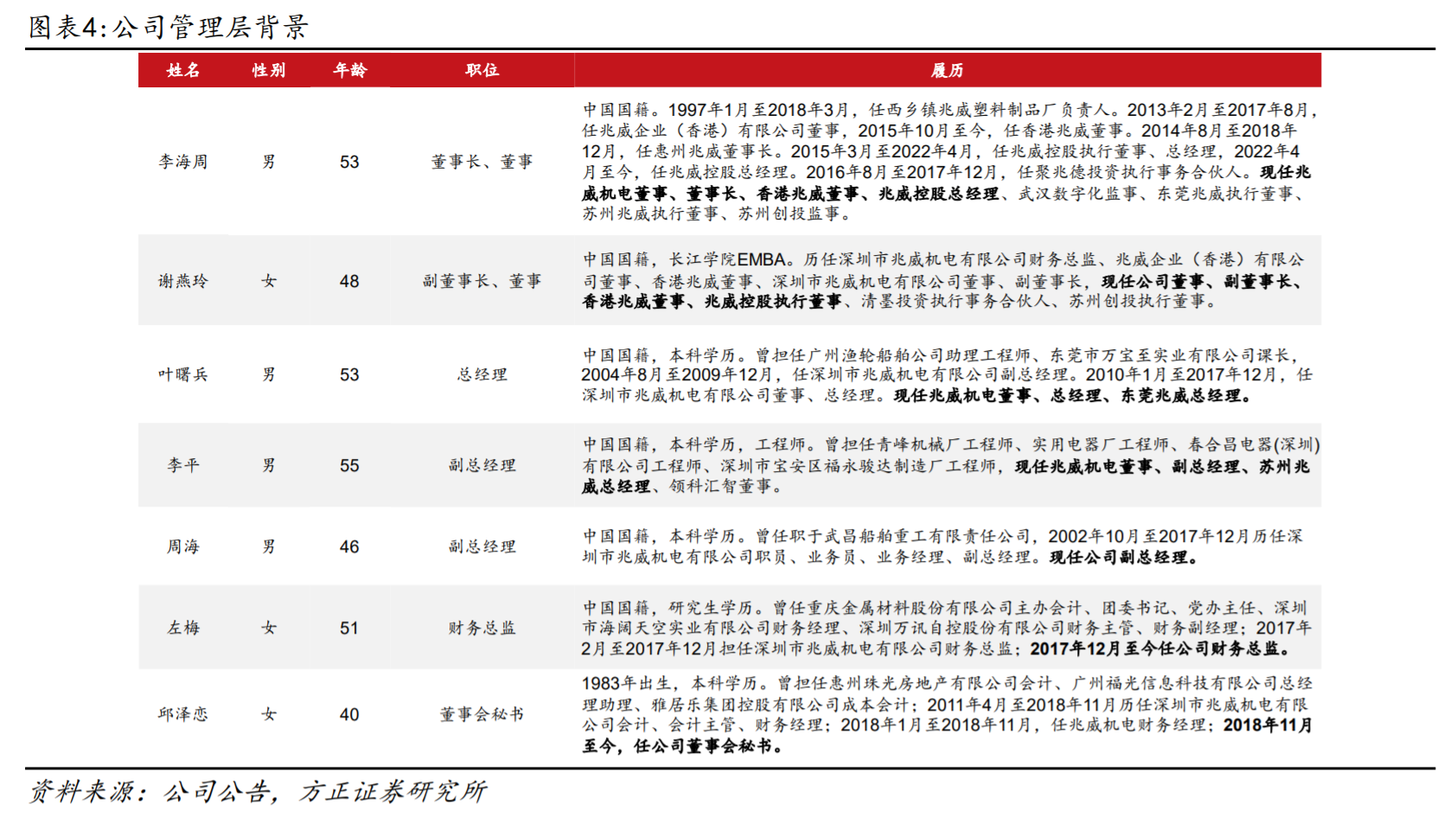 2)快速发展期(2009-2017):2009年开始,公司厚积薄发进入快速发展阶段,逐步搭建了以微型传动系统及精密注塑件为主的产品矩阵,并将应用场景拓宽至汽车电子、智慧医疗、智能家居、消费电子、工业装备五大领域,成长为行业内的标杆企业。公司于2011年成为格力、奥克斯等企业供应商,进军家电领域,并于2012年拓展通信行业应用,进入华为4G、5G通信基站电调系统供应链。