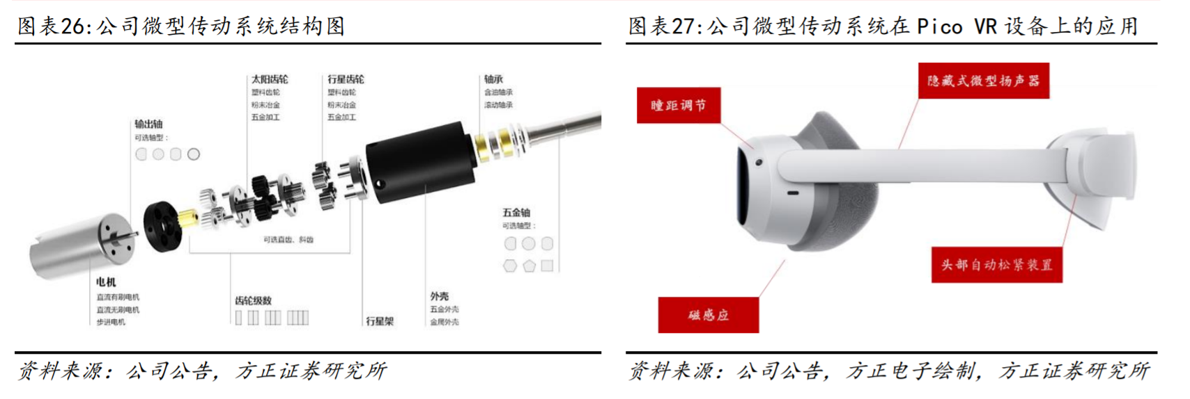 纵向一体化战略,提升公司产品价值量。公司深耕微型传动行业二十余年,聚焦微型传动系统产品,实施纵向一体化战略。目前公司已成熟掌握塑料注射成型、粉末冶金成型、金属粉末注射成型、金属机械加工多种齿轮生产工艺,是国内少数掌握多种生产工艺并实现规模化应用的企业之一。此外,公司在技术上垂直延伸突破,重点布局驱动控制技术,进一步纵向延伸至电机驱动控制模块,致力于为客户提供“精密部件+传动系统+控制系统”一体化的系统化解决方案。