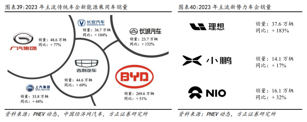 复盘公司国内主要客户的销量数据可以看到,各厂商均实现不同程度的增长。传统厂商方面,2023年比亚迪以近270万辆的销量领跑,同比增长51%,稳居第一梯队,广汽、长安、长城均实现70%以上的同比增长,分别销售48/37/24万辆。