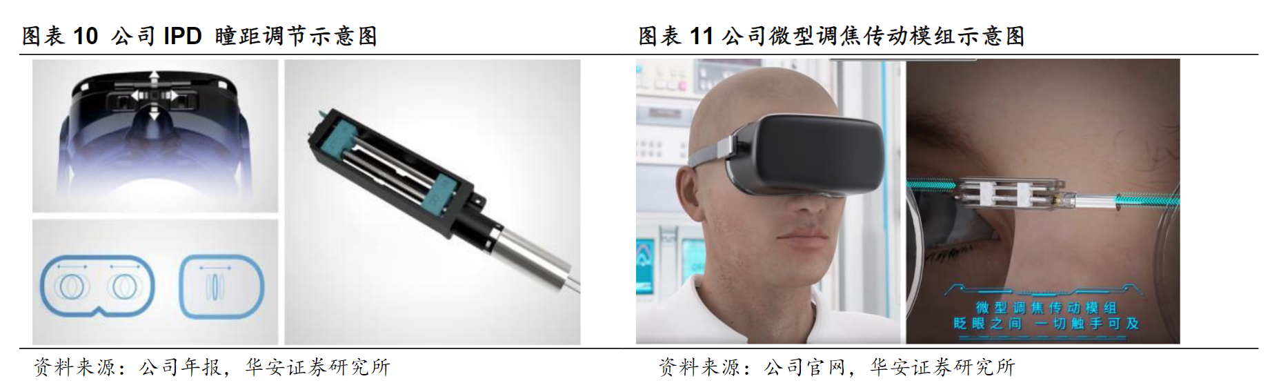 公司的瞳距调节驱动装置通过先进工艺和精巧设计,简化组装工艺、提高传递效率和调节精度,减少传动噪音,在降本增效的同时,更好地保证使用者获得较佳观看效果。此外,公司开发用于头盔式VR眼镜自动对焦,调节焦距,图像清晰度由人工调节升级为自动调节,有效提升产品体验感及科技感。目前,在微型电动调节机构运行的行程精度上,公司微型驱动机构可精确到1S走0.05mm行程,在一定程度上可协助缓解VR/AR沉浸眩晕的感觉。