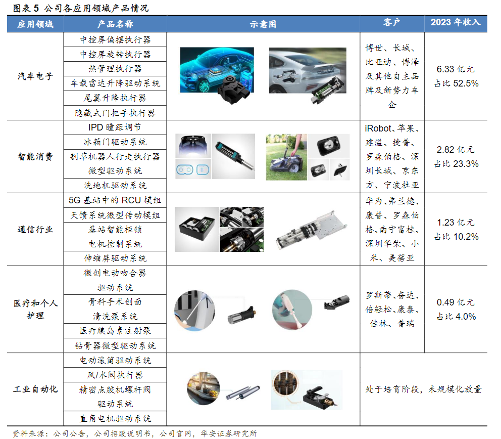 目前公司主要为汽车电子行业提供精密部件及微型传动、驱动系统产品,包括各类执行器、智能化电子驱动控制、运动控制系统等核心部件及驱动解决方案,产品综合分布于智能座舱域、车身域、底盘域等应用方面。