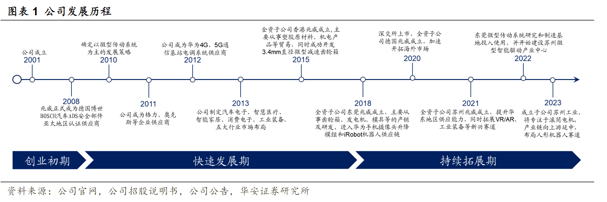 1)发展初期(2001-2008):确立“精密微小超薄”的产品技术路线,并为日本松下、尼康等公司提供精密齿轮和马达零部件,连续多年被多个客户评为A级供应商。公司于2008年成为德国博世ADS安全部件亚太地区认证供应商,正式进军汽车行业。