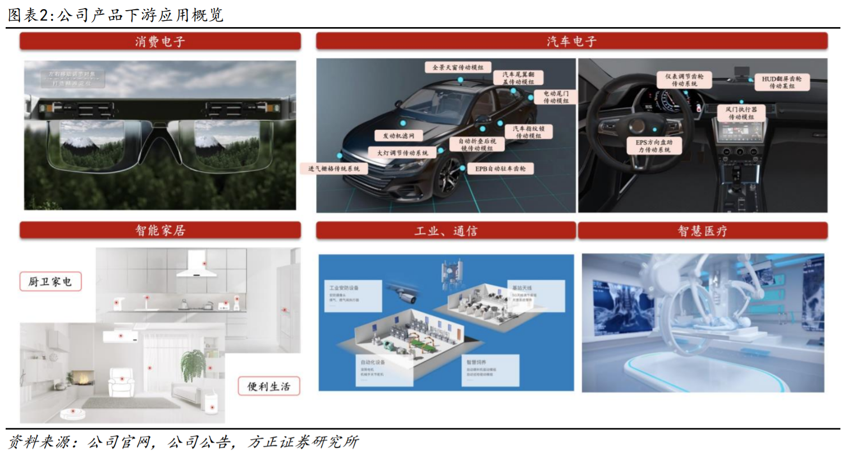 1)汽车电子:公司与博世、比亚迪、长城等主要汽车行业客户有多年的合作基础,公司提供的精密零件、传动系统、微型驱动产品得到了广泛的需求及品质认可。随着汽车电动化、智能化深入发展,公司产品单车配套价值量有望进一步提升。