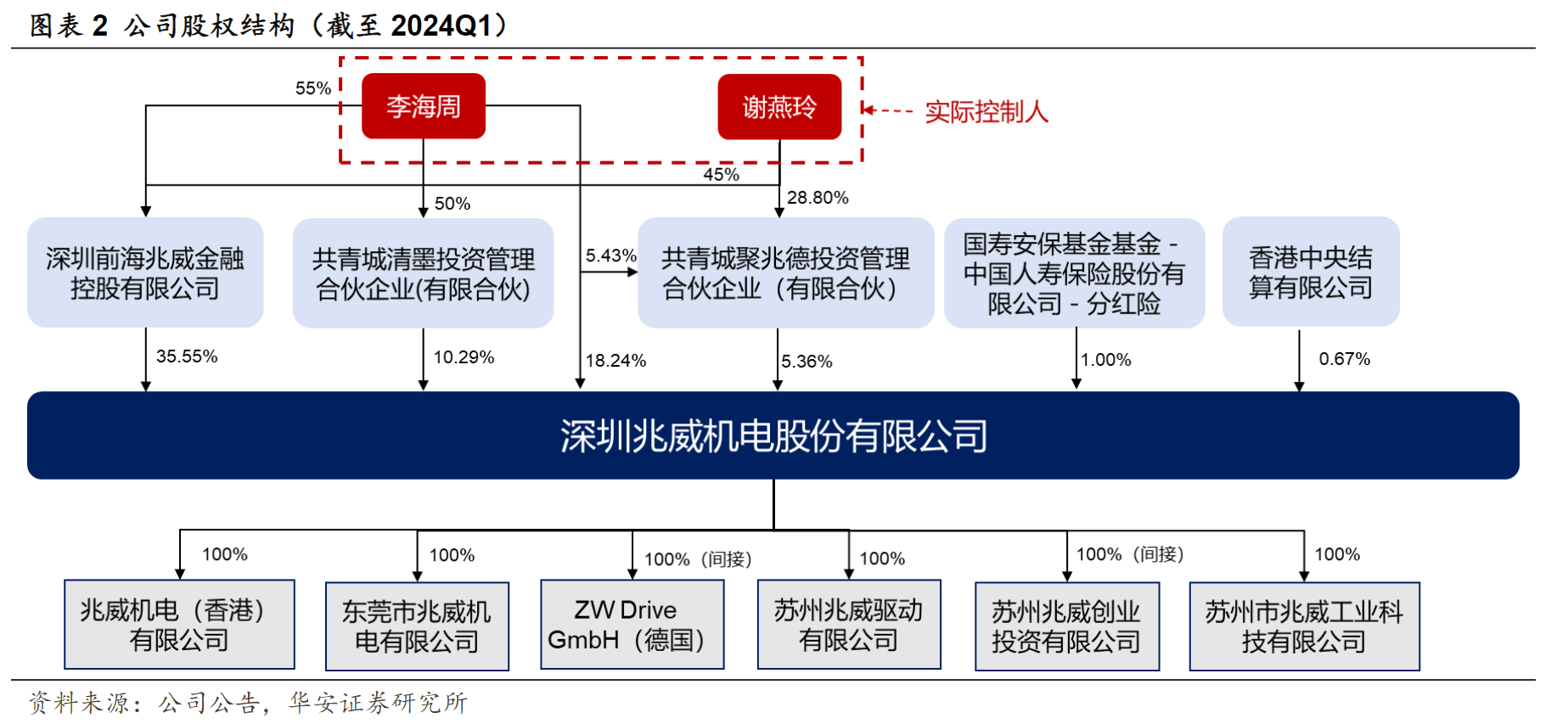 3)持续拓展期(2018年至今):公司于2018年组建电子控制团队,逐步形成微型传动到运动控制的全方案解决商,进入持续拓展期。2020年公司在深交所主板上市;2021年公司产业链向下游延伸,不断拓展VR/AR等新兴赛道;2022年,产业协同发展,东莞微型传动系统研究和制造基地投入使用,并开始建设苏州微型智能驱动产业中心;2023年公司产业链进一步拓展,布局人形机器人赛道。