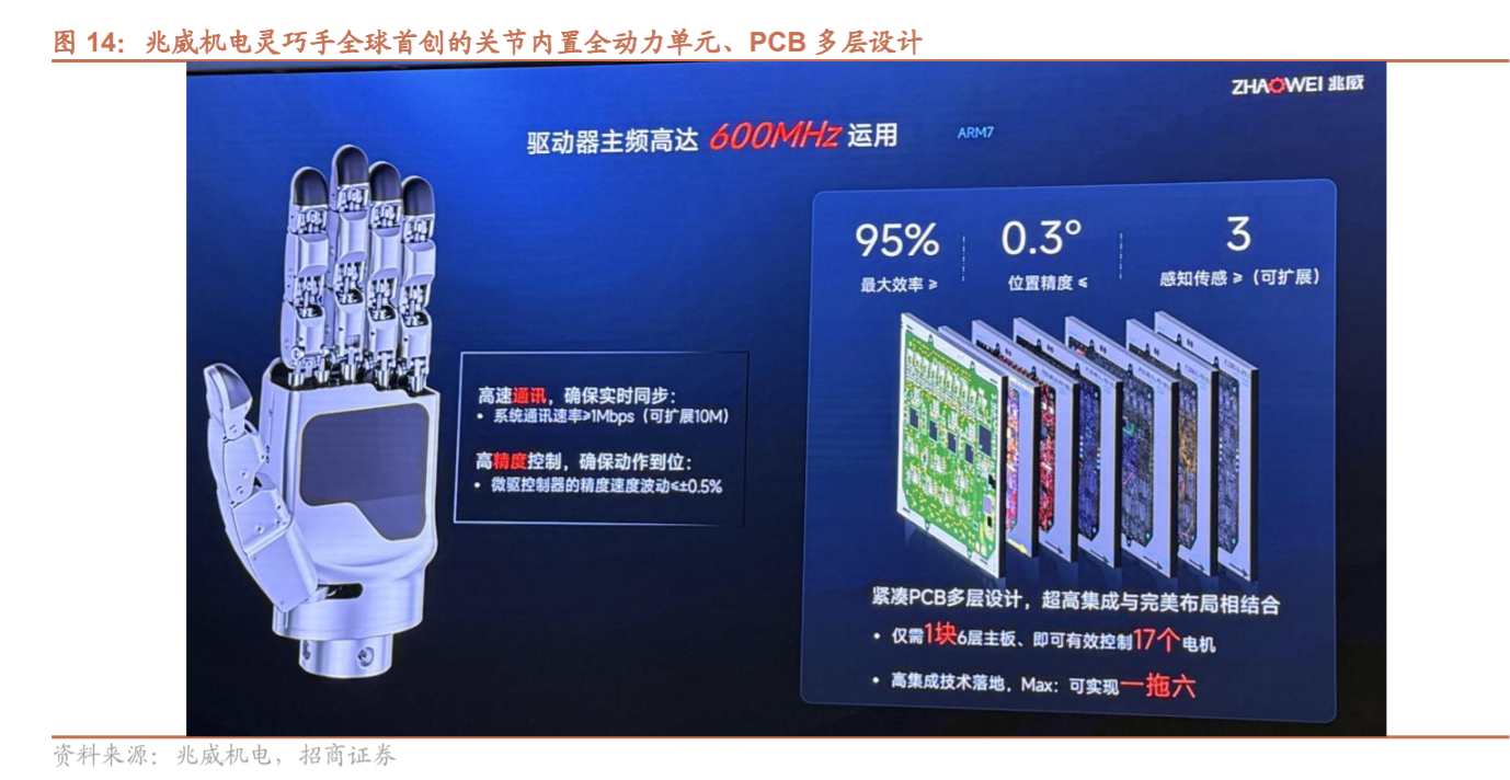3)多层PCB设计,最大效率≥95%、位置精度≤0.3°、感知传感≥3。发布会上,公司展示了穿针引线等应用场景,未来升级方向包括电子皮肤、小脑功能等。
