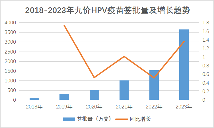 相关签批数据显示,2018年-2023年,九价HPV疫苗的签批量分别为121.6万支、332.4万支、506.6万支、1020.61万支、1547.72万支和3655.08万支,增速基本在50%以上,2023年九价疫苗签批数量同比增速为136.16%。