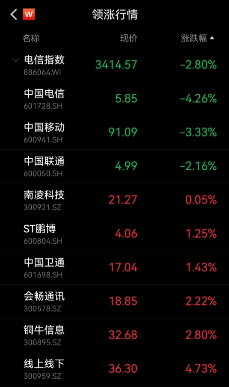 Wind数据显示,在行业板块中,电信股领跌。其中,中国联通跌2.16%,中国移动跌3.33%,中国电信跌4.26%。