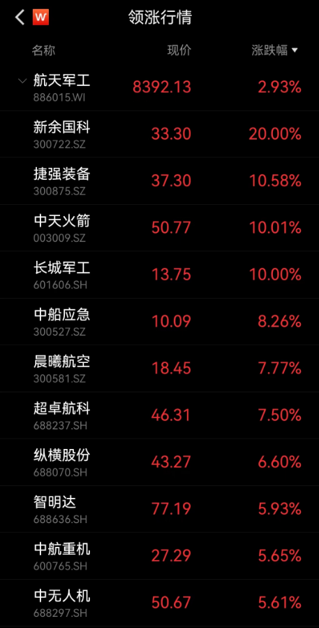 Wind数据显示,新余国科“20CM”涨停,中天火箭、长城军工涨停。