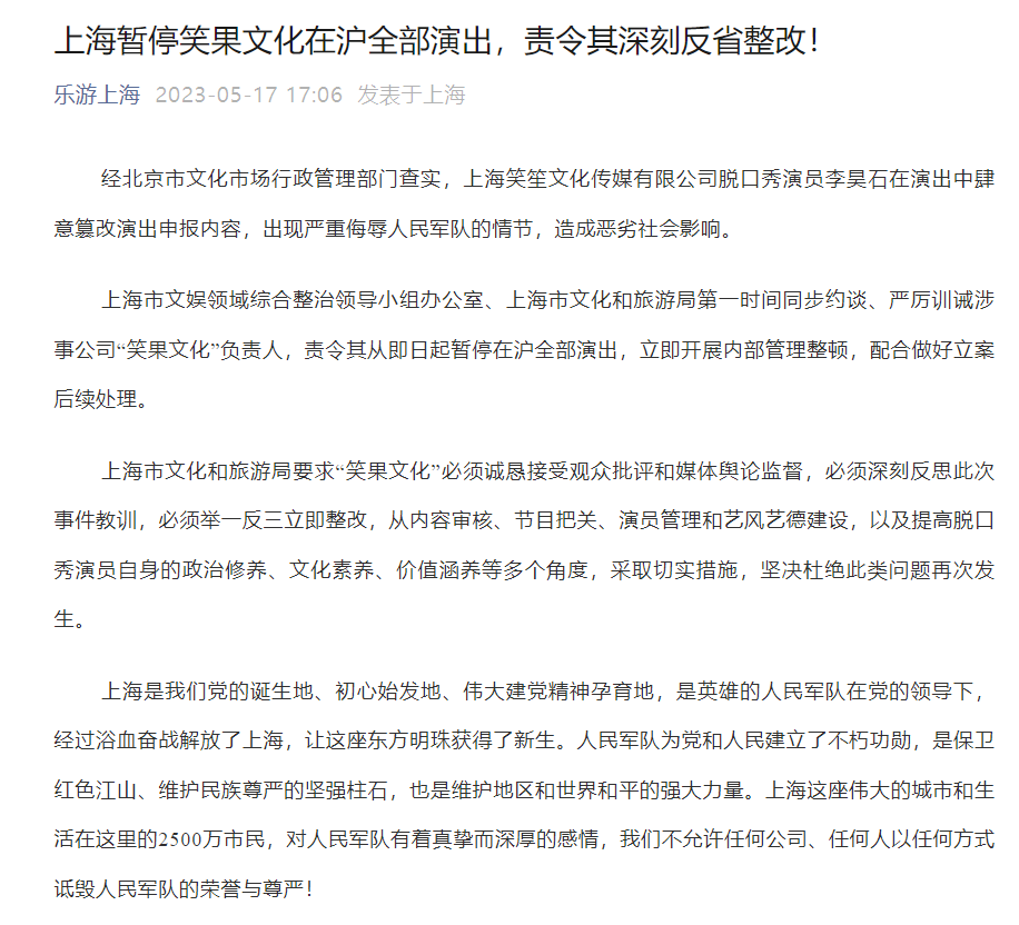 北京市文化和旅游局5月17日表示,2023年5月15日,北京市文化市场综合执法总队接群众举报,决定对上海笑笙文化传媒有限公司依法立案调查。经查实,该公司及其演员李昊石肆意篡改演出申报内容,在5月13日下午、晚上连续两场“笑果脱口秀”演出中出现严重侮辱人民军队的情节,造成恶劣社会影响。