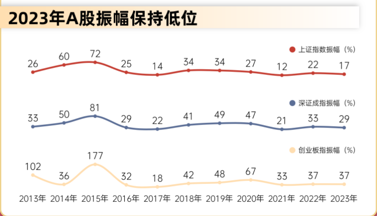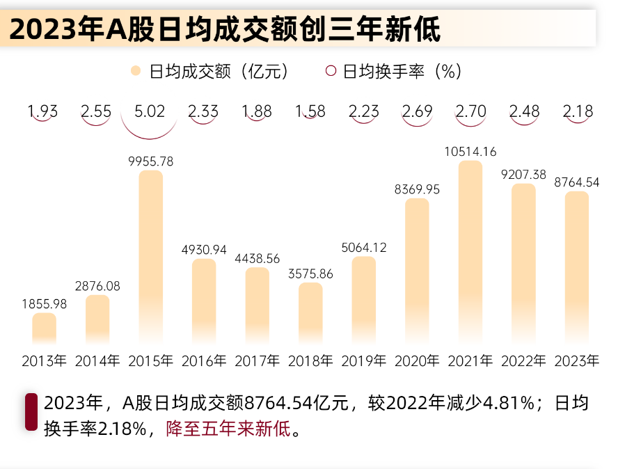2023年,A股市场呈现窄幅震荡格局,上证指数全年振幅在17%左右,较上个年度下降4.27个百分点;日均成交8764.54亿元,较上个年度减少4.81%,创近三年新低;日均换手率(以自由流通股本为计算基础)为2.18%,降至五年来新低。