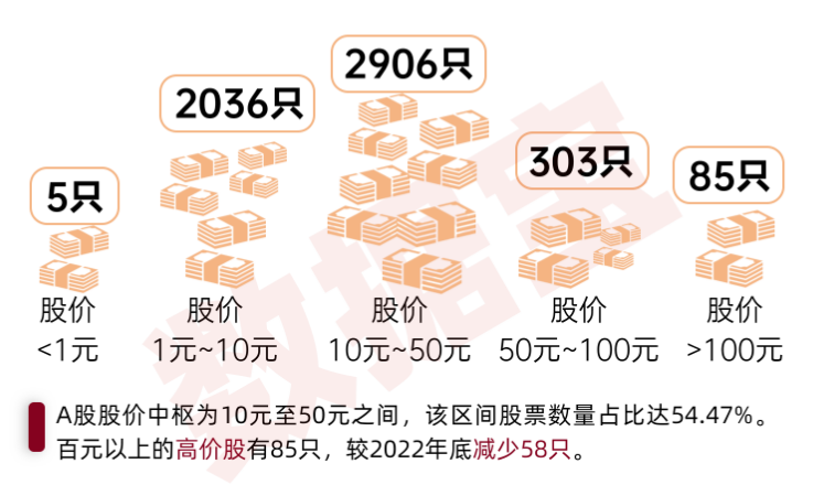 从股价分布来看,股价处于10元至50元之间的股票数量最多,占比达到54.47%;其次是处于1元至10元之间的,占比为38.16%;百元以上的高价股有85只,较2022年底减少58只。