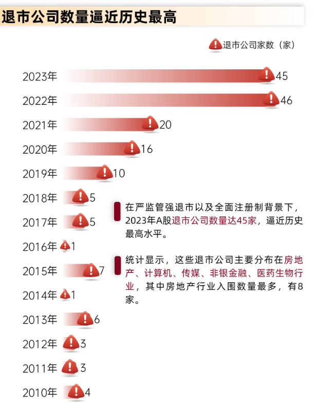 在严监管强退市以及全面注册制的背景下,2023年A股退市公司数量达到45家,逼近历史最高水平。统计显示,这些退市公司主要分布在房地产、计算机、传媒、非银金融、医药生物行业,其中房地产行业入围数量最多,有8家。