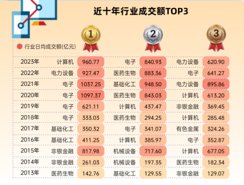 在人工智能(AI)浪潮的带动下,TMT板块(含计算机、传媒、通信、电子行业)热度大幅飙升,全年日均成交额占A股比例达到31.22%,创下历史新高。其中计算机行业日均成交960.77亿元,2010年以来首次问鼎行业成交额榜首;电子行业日均成交840.93亿元,排在第二位。
