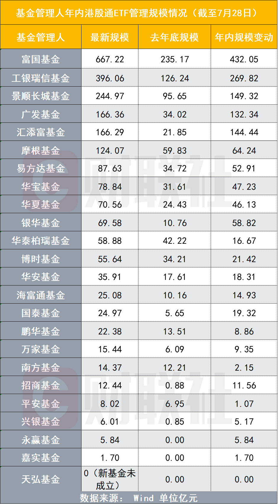 Wind数据显示,截至7月28日,78只已成立的港股通主题ETF(统计口径:基金全称包含“港股通”)合计规模为2358.26亿元,较去年底的824.61亿元增加了1533.65亿元,增幅达到185.98%。