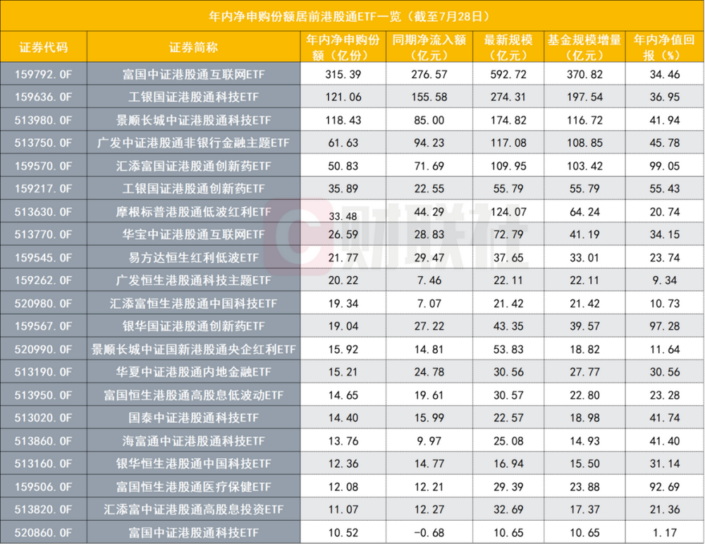 数据显示,年内被净申购份额最多的是富国中证港股通互联网ETF,年内基金份额增加315.39亿份。截至7月28日,该基金的规模份额均已接连创下新高,达592.72亿元、635.08亿份。