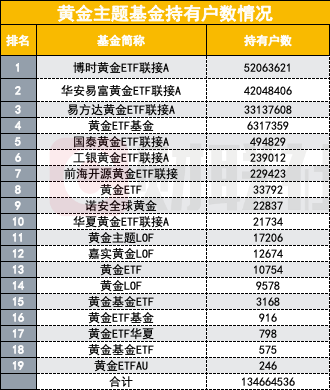 以wind进行粗略统计显示,全市场黄金基主题基金ETF持有人户数合计达到1.34亿。其中,博时黄金ETF联接基金,持有户数超过5206万户,华安易富黄金ETF联接户数4204万户,易方达黄金ETF联接户数也达到了3314万户。