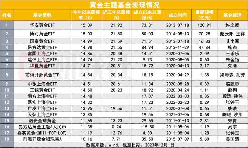 从基金收益来看,截至12日1日,今年以来黄金主题基金涨幅均超过10%,其中,市场规模最大的华安黄金ETF收益率最高,为15.09%,此外,博时、国泰、易方达等黄金ETF涨幅紧随其后,此外,富国、建信等上海金ETF涨幅同样不俗。