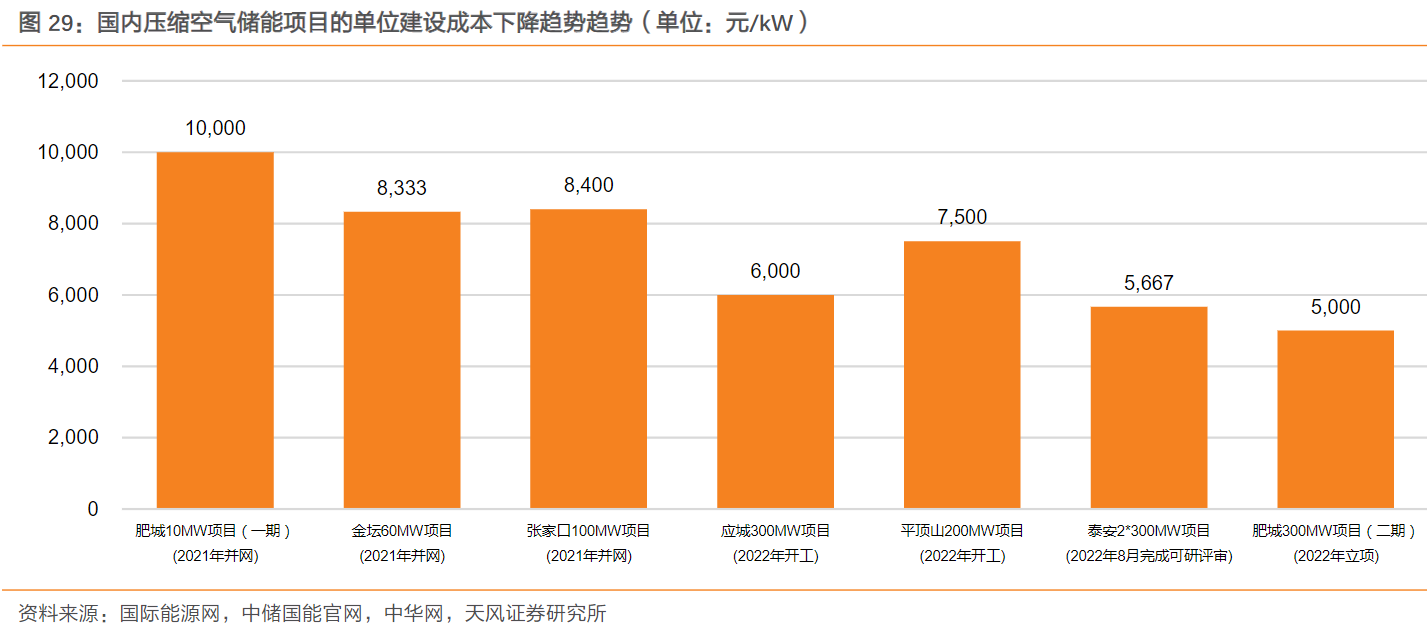 公司切入上游核心设备供应,市场空间大,国内压缩空气储能项目的单位建设成本下降趋势趋势成本下降,系统规模增加后,单位投资成本也持续下降,系统规模每提高一个数量级,单位成本下降可达30%左右,压缩空气储能目前每千瓦的造价大概是5000到6000元,已接近抽水蓄能约5500元/kW的建设成本。