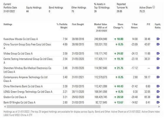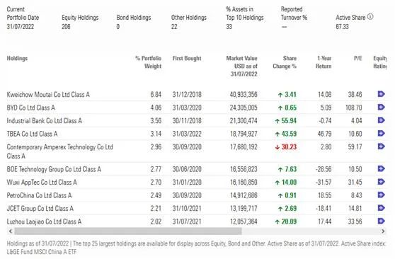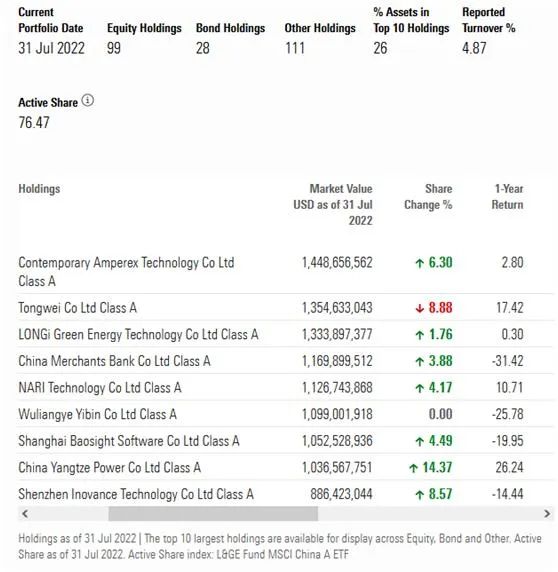 据晨星数据显示,摩根基金-中国A股机遇基金的前几大重仓股分别为宁德时代、通威股份、隆基绿能、招商银行、国电南瑞、五粮液、宝信软件、长江电力和汇川技术。截至7月末,基金共持有99只股票,前十持仓占比26%。