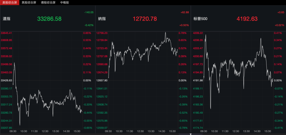 Wind数据显示,截至当日收盘,道琼斯工业指数跌0.42%,报33286.58点;标普500指数涨0.02%,报4192.63点;纳斯达克指数涨0.50%,报12720.78点。