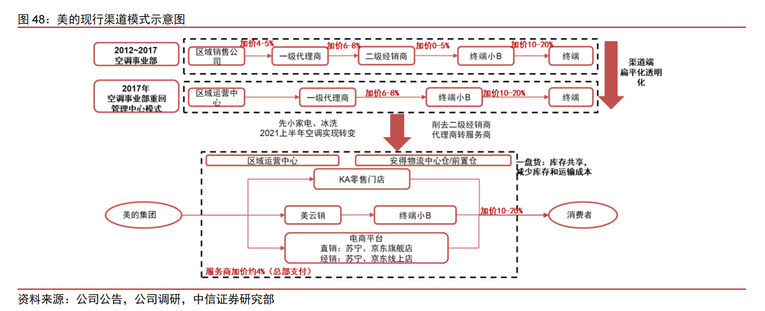 此时,美的却在方洪波的带领下换上了一套更轻的产销模式:在生产端,美的推行高周转、低库存的“T+3”模式;在销售端,美的谨守“不让中间商赚差价”的原则,一边打入线上渠道,一边改造线下销售网络。“T+3”模式的核心在于“快”。2018年,铜、铝等原材料的价格先涨后跌,美的在上半年涨价时减产,下半年降价时加班,一年下来,就有705万部比格力成本更低的空调。而销售端的精简,则进一步为美的释放出了更高的加价率,加上原材料下行所带来的成本优势,仓库里塞满便宜空调的美的顺理成章地发动了价格战。