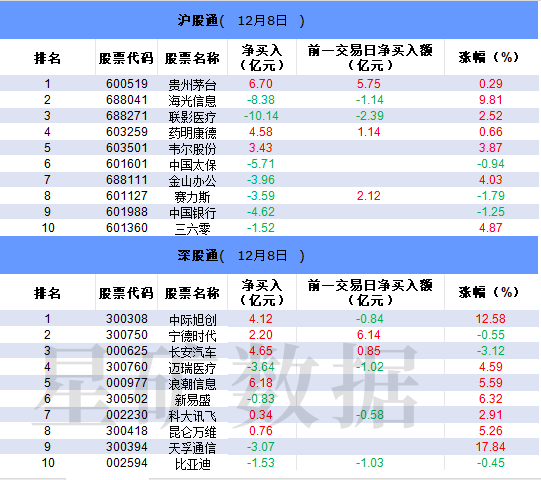沪深股通两市前十大成交中净卖出个股略多。买入方面,贵州茅台净买入居首,浪潮信息净买入居次席,长安汽车、药明康德、中际旭创均获净买入超4亿。