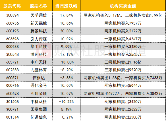 卖出方面,多只高位股遭机构卖出,其中中广天择遭机构卖出1.16亿,信雅达遭机构卖出1.58亿,通化金马遭机构卖出超5000万。