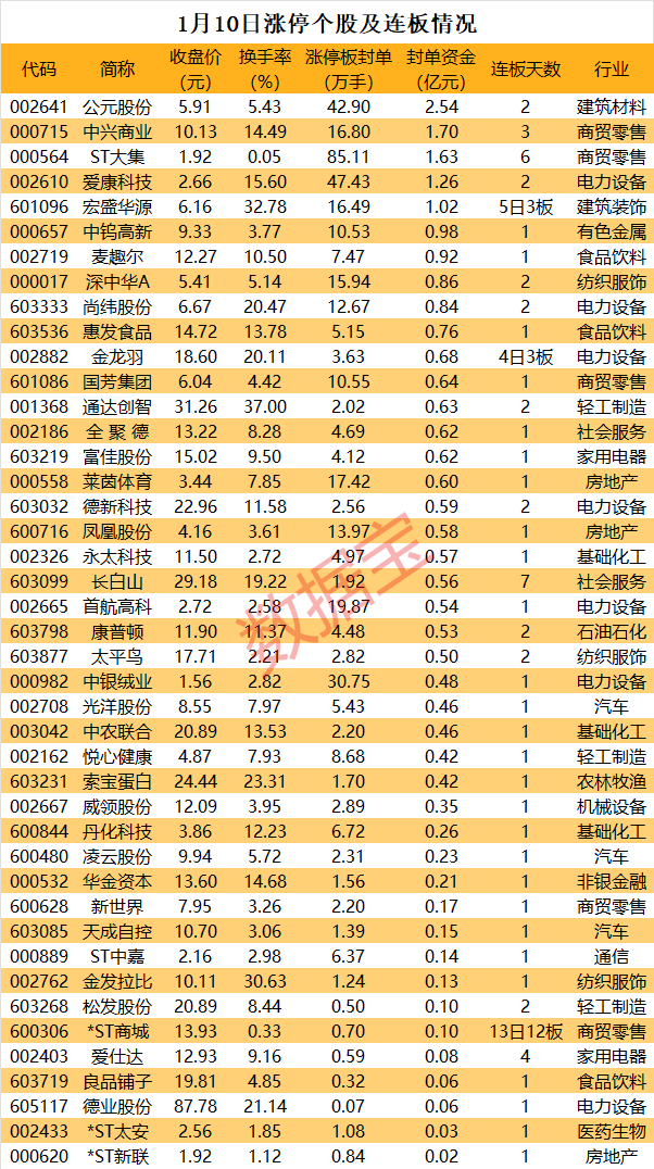 以封单金额计算,5股封单金额超1亿元,其中公元股份为2.54亿元,中兴商业为1.7亿元,ST大集为1.63亿元。