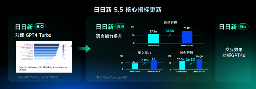 实时交互能力背后的支撑来自于商汤最新的基座模型。在会上商汤同时宣布大模型迭代到“日日新5.5”,其综合性能较上一代“日日新5.0”平均提升30%,在数学推理、英文能力和指令跟随等能力明显增强。
