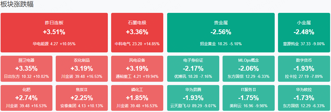 市场早盘冲高回落,三大指数再度集体翻绿,而微盘股指数涨超1%。沪深两市半日成交额1.51万亿,较上个交易日缩量884亿。盘面上热点快速轮动,部分题材反复走强,全市场超2900只个股上涨。从板块来看,化工板块延续强势,潞化科技、金煤科技双双2连板,金正大、红宝丽、泸天化等多股涨停。风电板块反复活跃,通裕重工20CM涨停,天顺风能、远程股份涨停。电池材料概念快速走高,负极、电解液方向领涨,璞泰来涨停。下跌方面,算力租赁概念集体退潮,美利云跌停,优刻得、云天励飞等多股大跌。